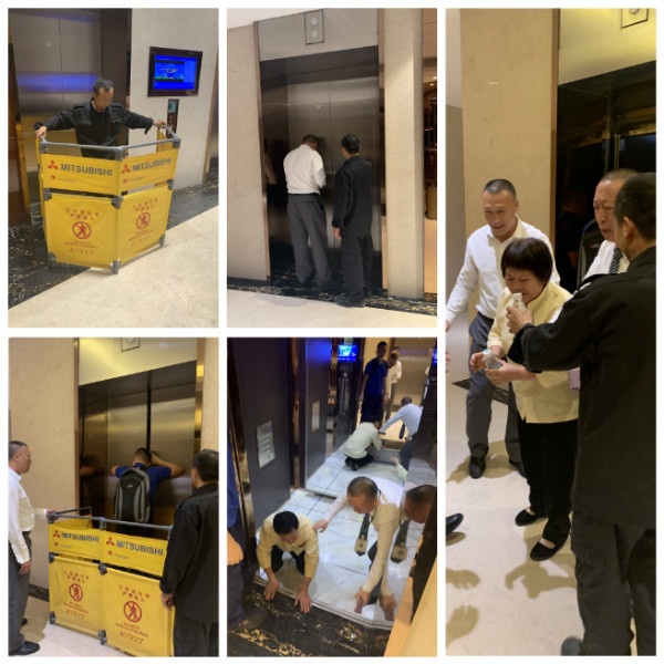 保安部值班人员接报后立即赶到电梯故障现场,配合工程部,通过拍打电梯轿厢门来了解被困人员情况,及时进行安抚和提醒注意事项,通报外边救援进度;