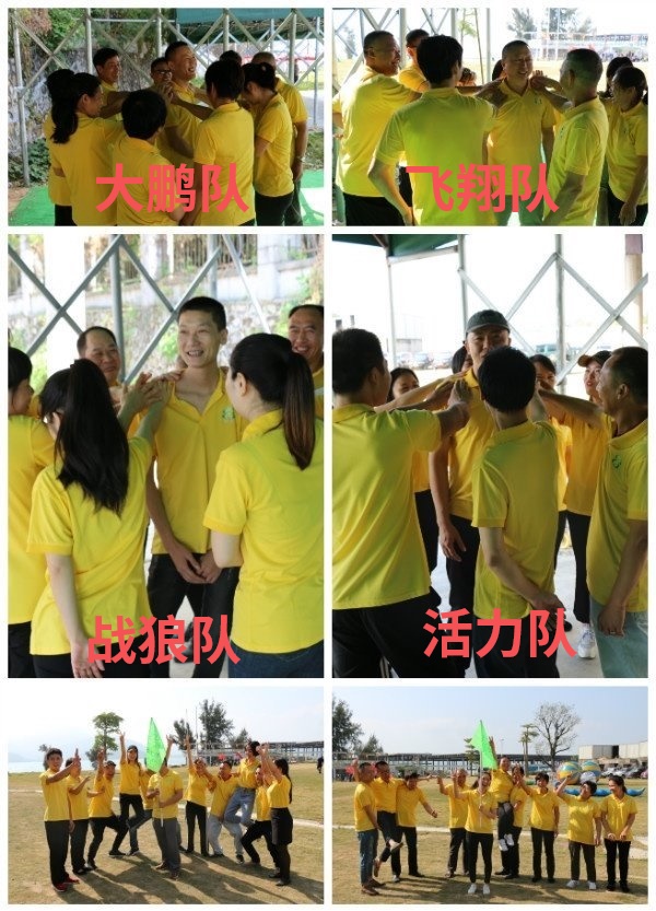 在罗教练的带领下,把大家随机分成4个小组,由队员选出队长和秘书,接着取队名,喊口号,排队形,进行团队风采展示和游戏项目的比拼。
