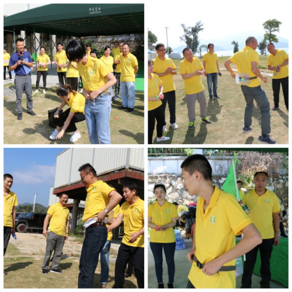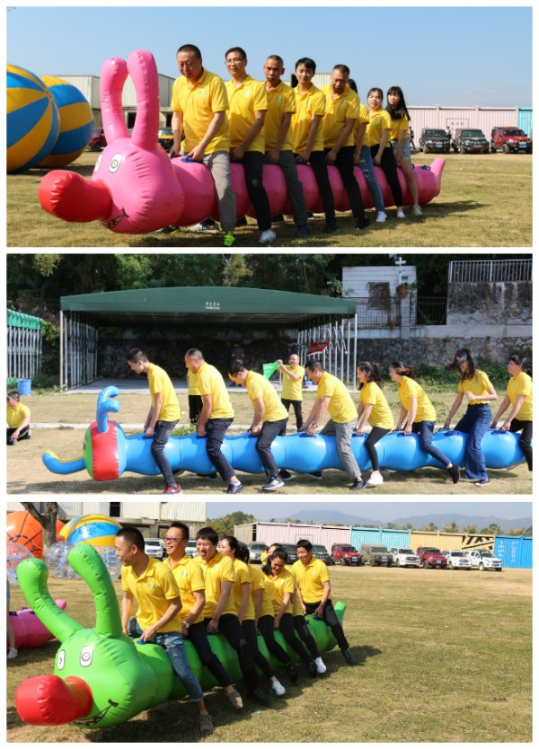 首先进行的第一项活动——毛毛虫竞速,考验的是团队的配合度和协调性,在罗教练的口令下,1212的呐喊声响起,4个小组奋力往前,齐头并进,随着步伐一前一后,距离逐渐拉开,胜负已分。活力队步调一致,节奏快速,取得第一轮团队游戏的优胜,淋漓尽致地展现了劲往一处使的团队精神。